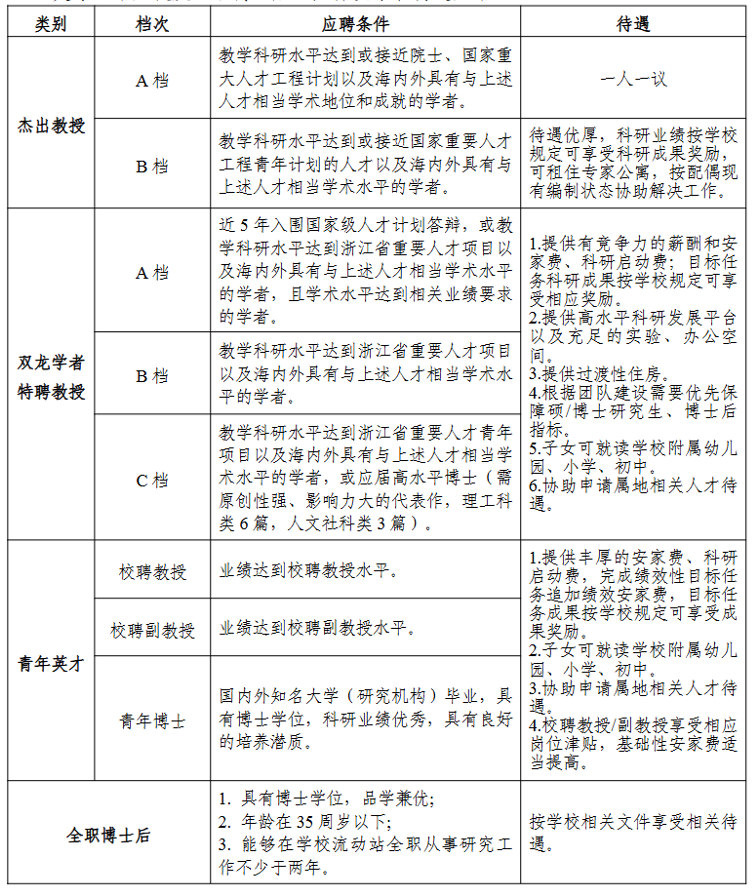学校常年面向海内外诚聘各类型及相当学术水平的人才,根据拟引进 人员的教学科研水平,引进人才分为杰出教授、双龙学者特聘教授、青年 英才 3 个层次及全职博士后。具体要求和待遇如下: